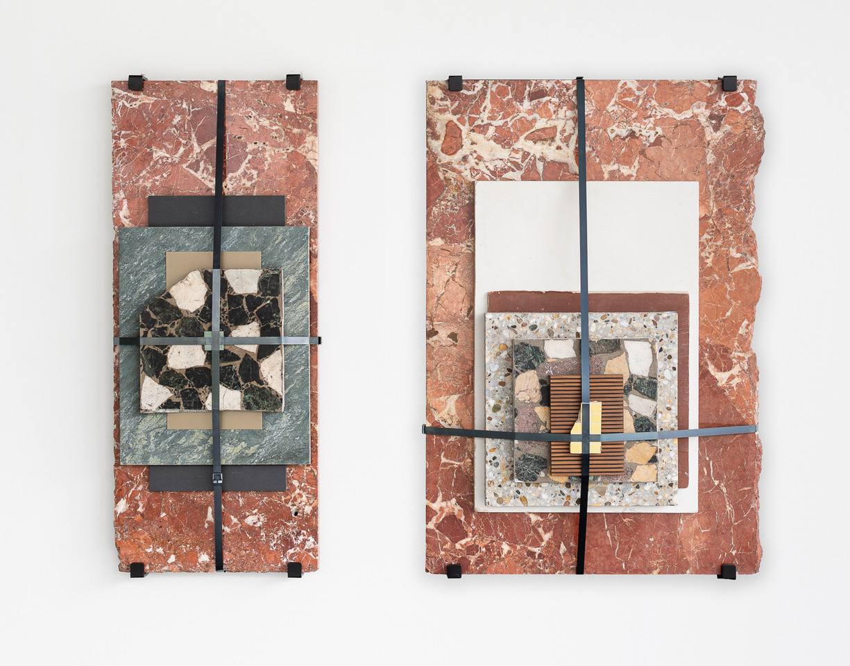 “Nine Buildings, Stripped” is a long-term project that documents the changing architectural surfaces of the city by collecting actual fragments of buildings, both demolished and newly built. The results are “material packages”, wall-mounted sculptures composed of original parts of buildings that no longer exist and samples or parts of the structures that replaced them (facade elements, floorboards, tiles, glass panels, doors, bricks, color samples, etc.). They offer radically abstract portraits, reduced to materiality, colors, and tactile qualities, of specific urban situations across time. Between image and sculpture, surface and depth, document and construct, they embody example cases of how we build and rebuild at given moments: material freeze-frames that capture the complexity of the city’s genesis in vivid tableaus.